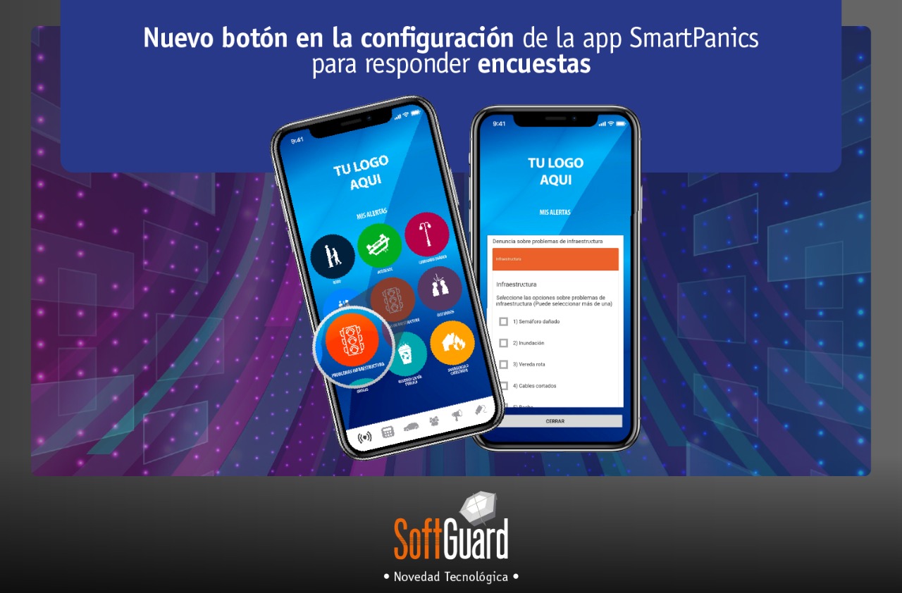 Ahora todos los botones, tanto los de emergencias de la pantalla principal cómo los botones personalizados de mis alertas pueden ser configurados para encuestar al usuario.A través de una sencilla configuración, quien use la App podrá responder distintas preguntas de interés para el prestador del servicio, sea una compañía de seguridad privada, un municipio o una urbanización privada. Al responder el usuario genera en el sistema SoftGuard un evento con la encuesta adjunta para su análisis y tratamiento.Para complementar esta excelente prestación desde el módulo Desktop SmartPanics, se podrá obtener estadísticas de las respuestas obtenidas.